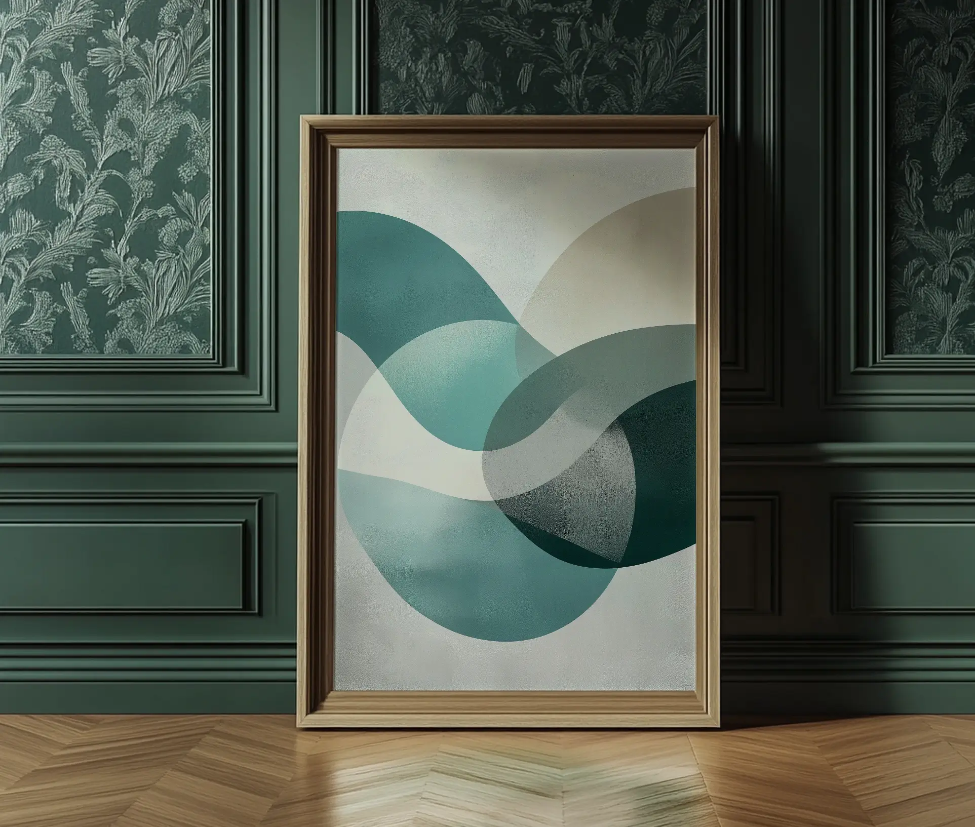 Denne smukke abstrakte plakat kombinerer flydende, organiske former i beroligende blå, grønne og beige nuancer. De bløde overlappende farver skaber en harmonisk balance, der bringer ro og elegance ind i ethvert rum.