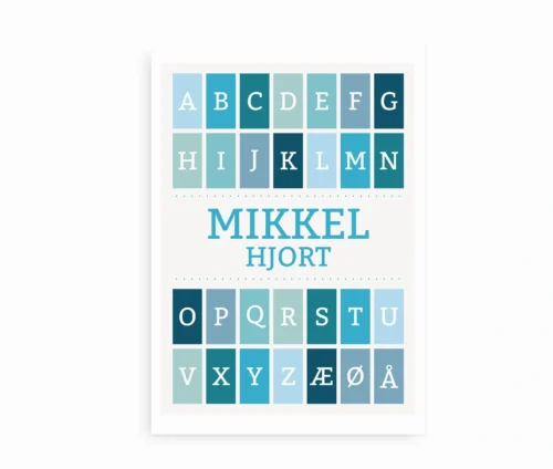 Denne smukke navneplakat i blå nuancer kombinerer leg og læring i ét dekorativt design. Plakaten er bygget op omkring det danske alfabet, hvor hvert bogstav er placeret i sin egen farvede firkant i rolige blå og turkise toner. I midten af plakaten fremhæves barnets fornavn og efternavn i matchende blå farve, hvilket gør den helt personlig og unik.