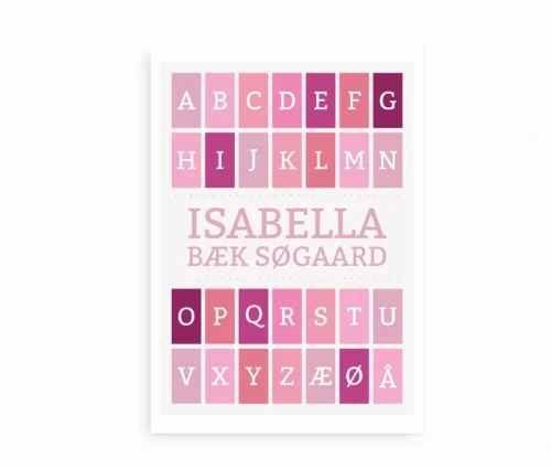 Designet består af alfabetets bogstaver opdelt i små firkanter i varierende lyserøde og rosa nuancer. Midt i plakaten fremhæves barnets fulde navn med store bogstaver i en blid rosa farve. Det giver plakaten et personligt og kærligt udtryk, som passer perfekt til barnedåb, fødselsdag eller navngivning.