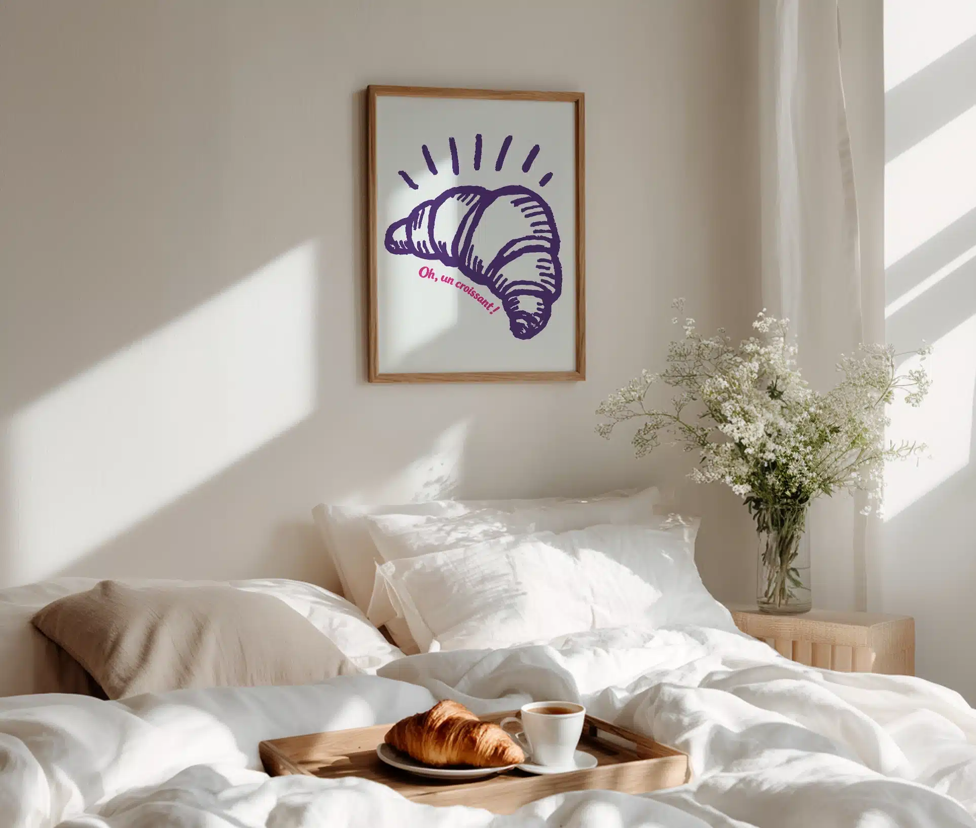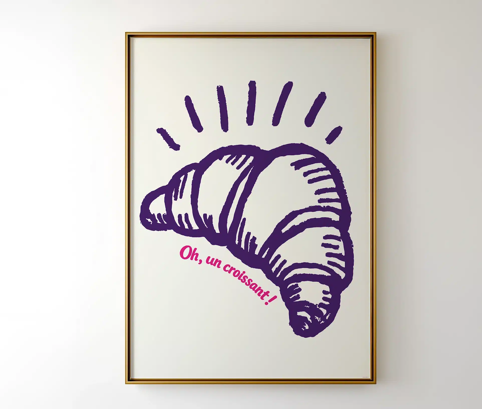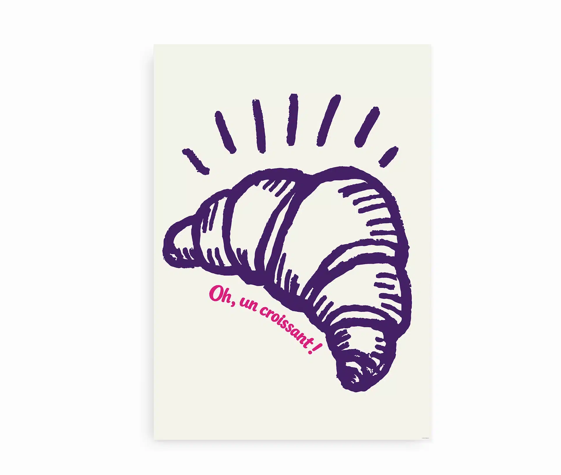 Drømmer du om fransk caféstemning, langsomme morgener og duften af friskbagt brød? Oh un croissant plakat bringer den helt særlige følelse af Paris direkte ind i dit hjem. Med sit håndtegnede croissantmotiv i dyb lilla og den legende pink tekst skaber plakaten et moderne, kunstnerisk og charmerende udtryk.