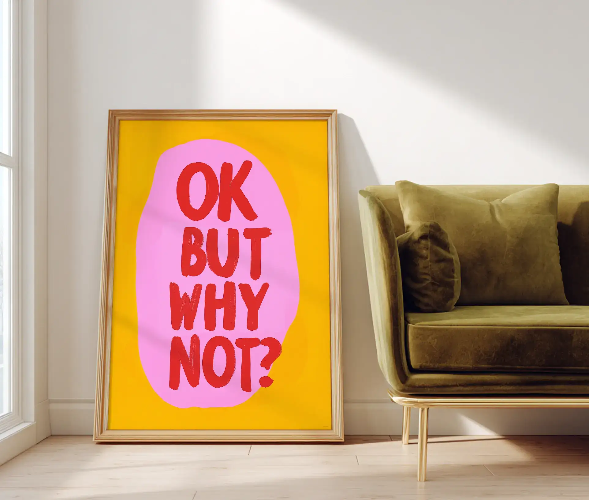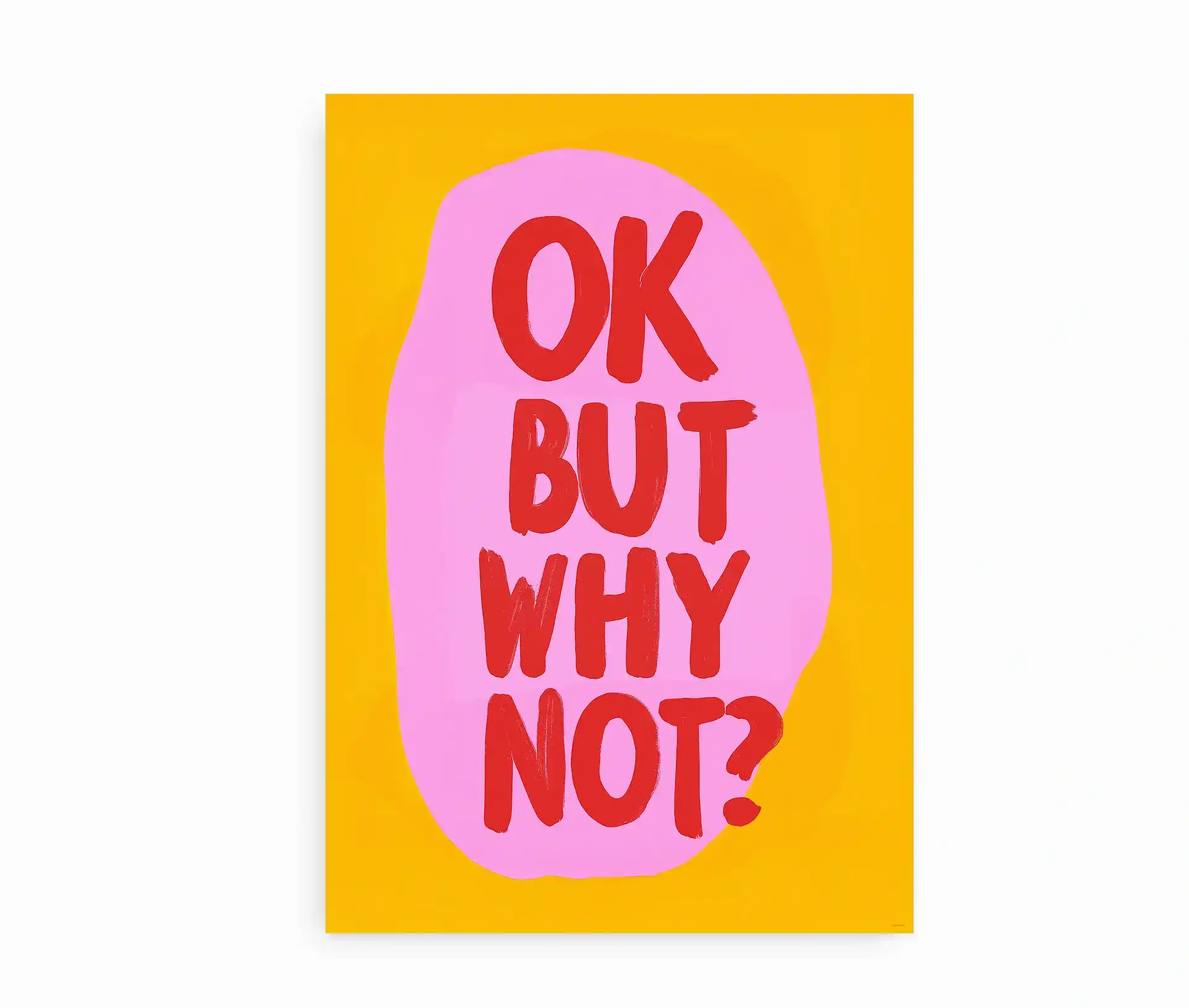 Når man har brug for en lille påmindelse om at sige ja til livet – eller bare gerne vil tilføje lidt ekstra power til sin indretning – så er denne plakat med teksten “OK BUT WHY NOT?” det perfekte valg. Den stærke farvekombination af gul baggrund, pink form og rød tekst giver plakaten en legende, poppet og selvsikker energi, som vil lyse ethvert rum op. Uanset om den hænger i stuen, entréen, på kontoret eller teenageværelset, sætter den tonen for et sted med personlighed og humor.