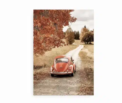 Denne smukke On the Road plakat med en folkevogn fanger essensen af nostalgi, frihed og efterårets varme farver. Motivet viser en klassisk folkevogn i dyb rød, parkeret på en snoet landevej, flankeret af gyldne blade og træer i efterårsdragt. Kombinationen af det tidløse bilmotiv og den stemningsfulde natur skaber en plakat, der både er dekorativ og fyldt med sjæl.
