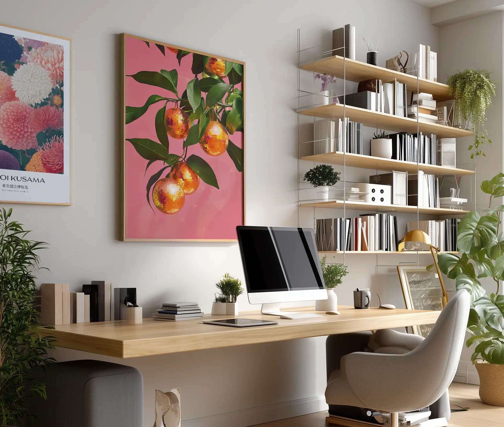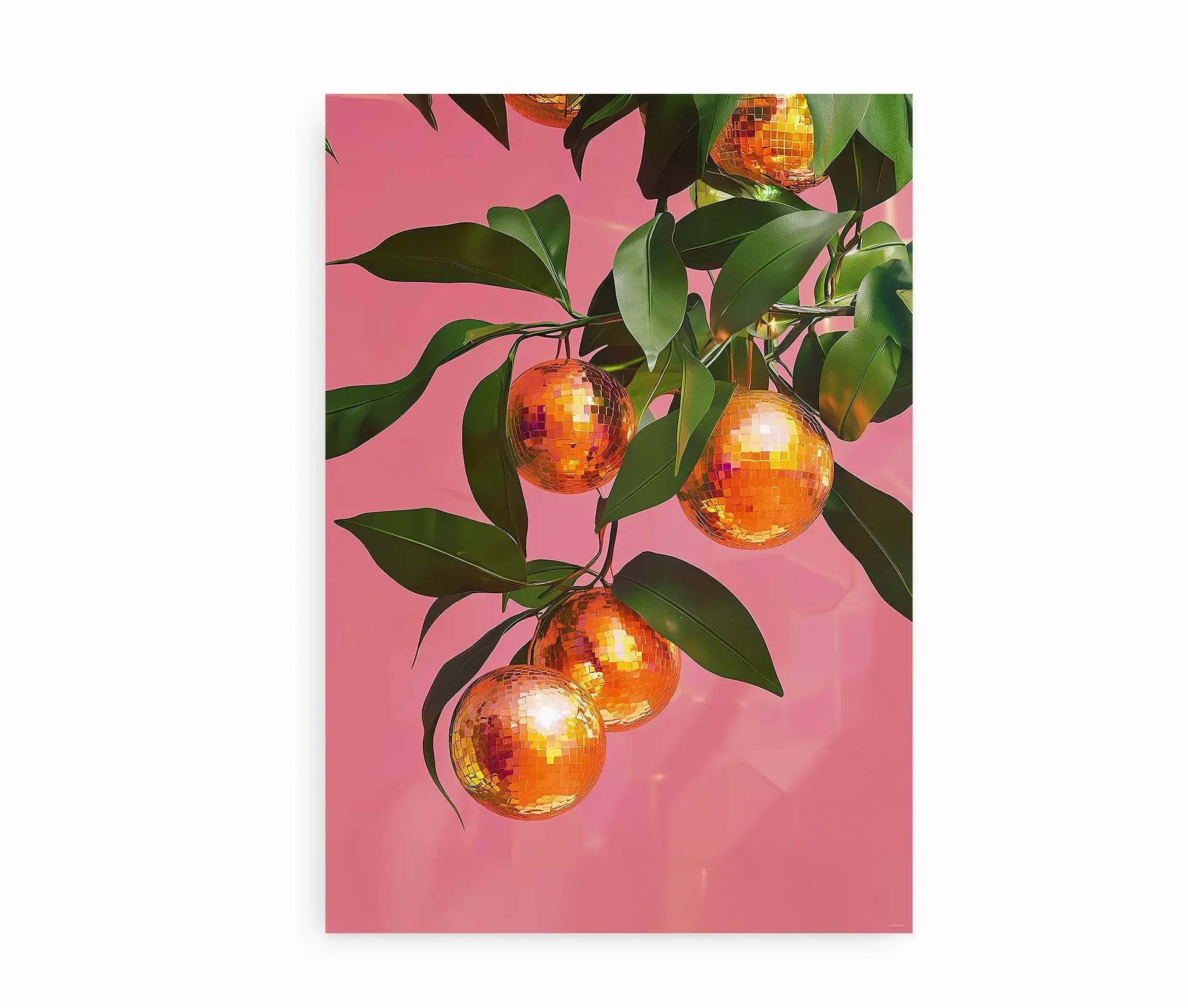 Gør plads til tropisk disco-vibe i din indretning med plakaten Orange Disco. Med en eksplosion af farver, glans og grafisk legesyge byder denne plakat på en visuel fest for sanserne. Her er grønne, frodige blade i tæt kontrast til orange discokugler, der hænger som frugt fra grene – og hele det festlige motiv står mod en gennemført lyserød baggrund. Det er kitsch, det er cool, og det er kunst med attitude.