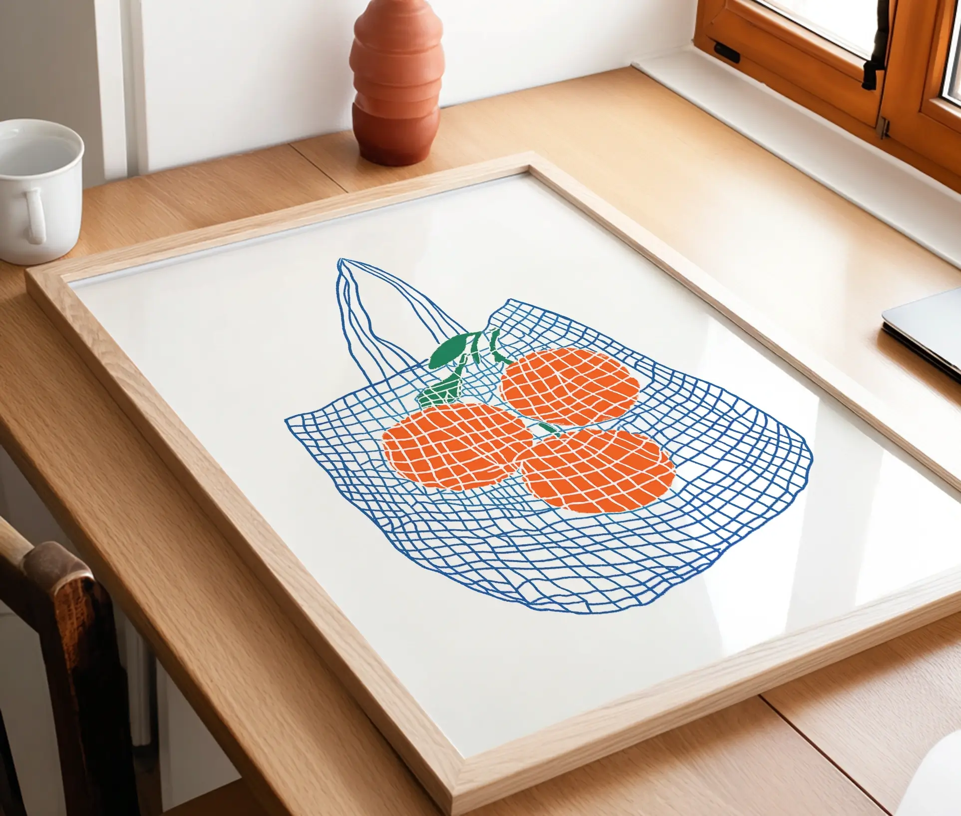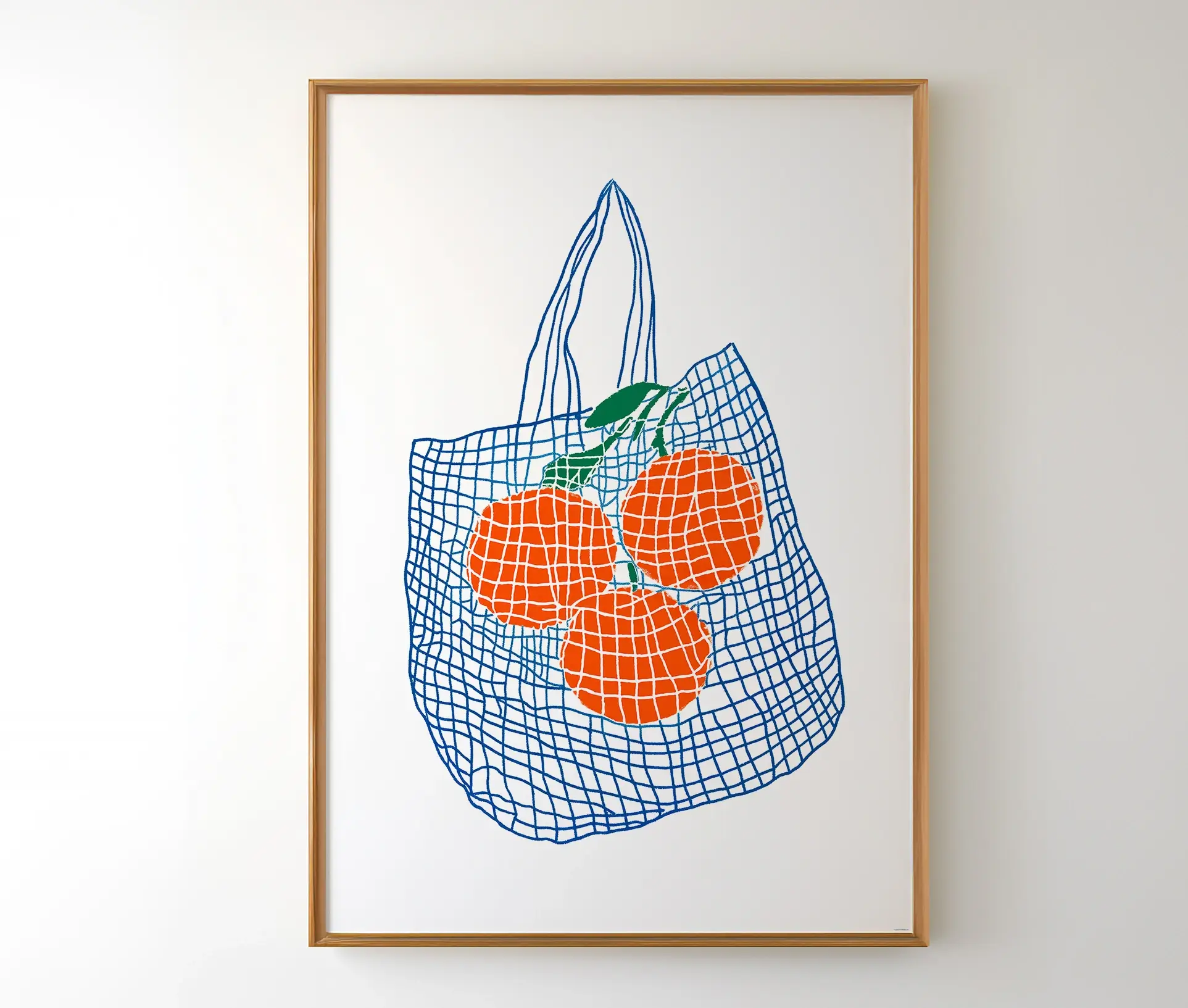 Denne plakat med titlen Oranges in Shopping Bag er en moderne kunstplakat, der kombinerer enkelhed med et friskt og livligt udtryk. Motivet viser tre klare orange frugter i en blå netindkøbspose, gengivet i en stiliseret og minimalistisk streg. Det grafiske udtryk med de stærke kontraster mellem den hvide baggrund, de orange frugter og de blå linjer giver plakaten et let, men samtidig markant udtryk.