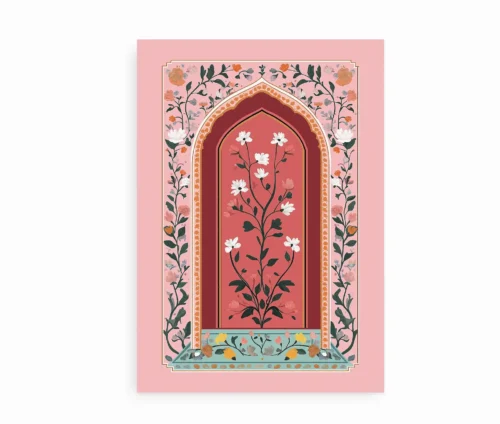 Denne dekorative plakat kombinerer orientalsk æstetik med et moderne farveunivers i varme nuancer af rosa, rød og støvet grøn. I centrum af motivet står en elegant bueform med blomsterranker. Som strækker sig op mod toppen og skaber et nærmest poetisk udtryk. De fine blomster og bladornamenter i hvid, grøn, orange og lyserød indrammes af en rig og detaljeret bort. Hvilket leder tankerne hen på klassisk indisk eller persisk kunst.