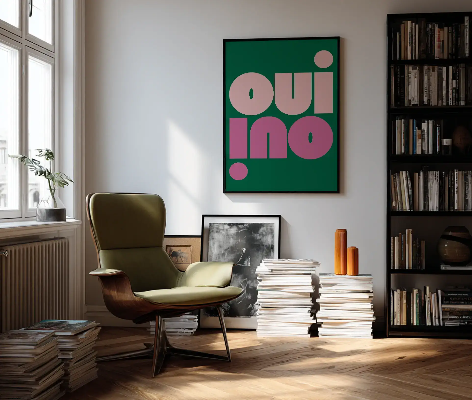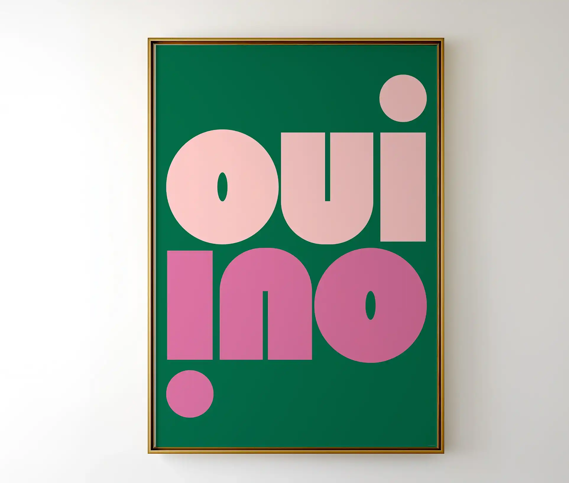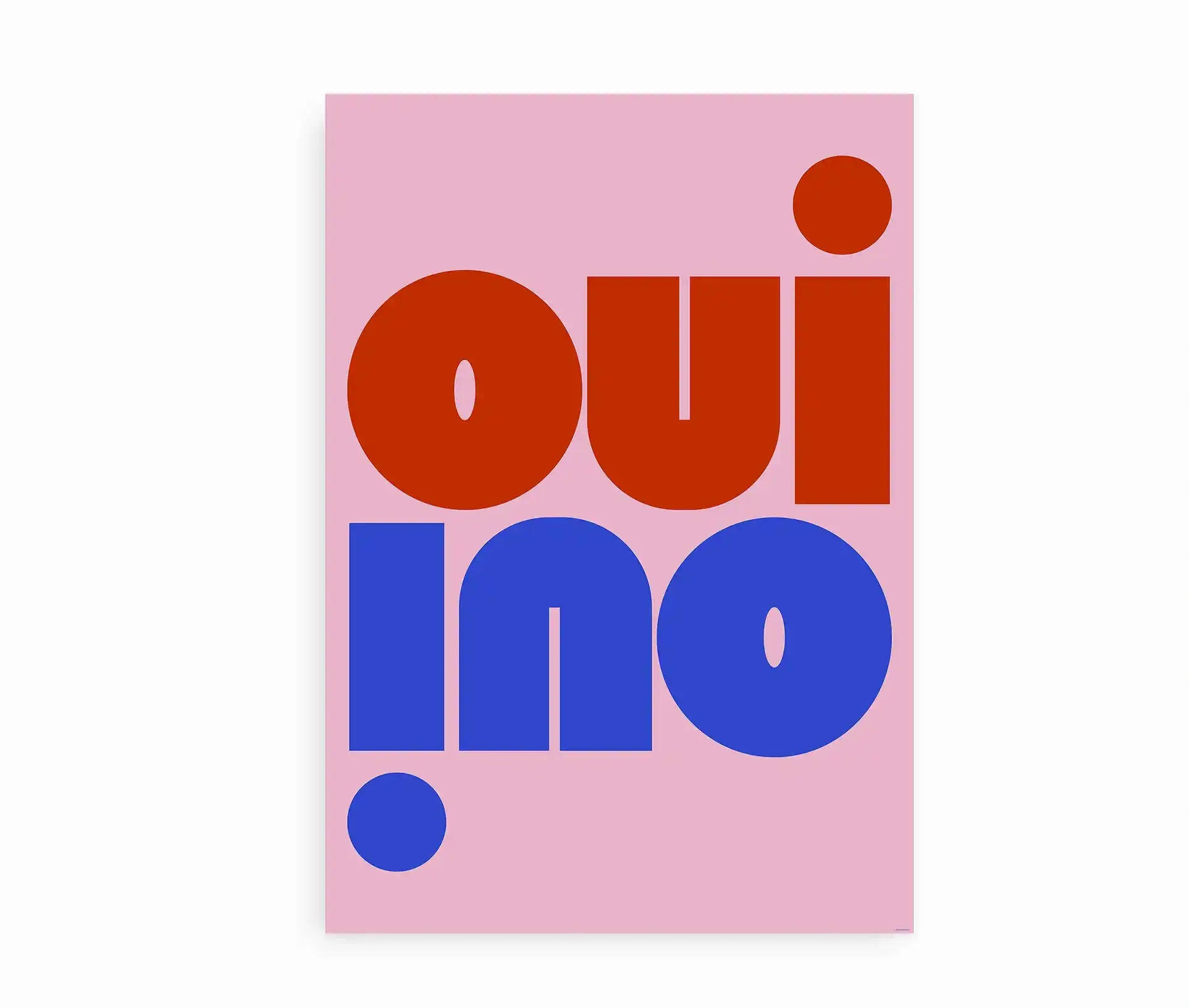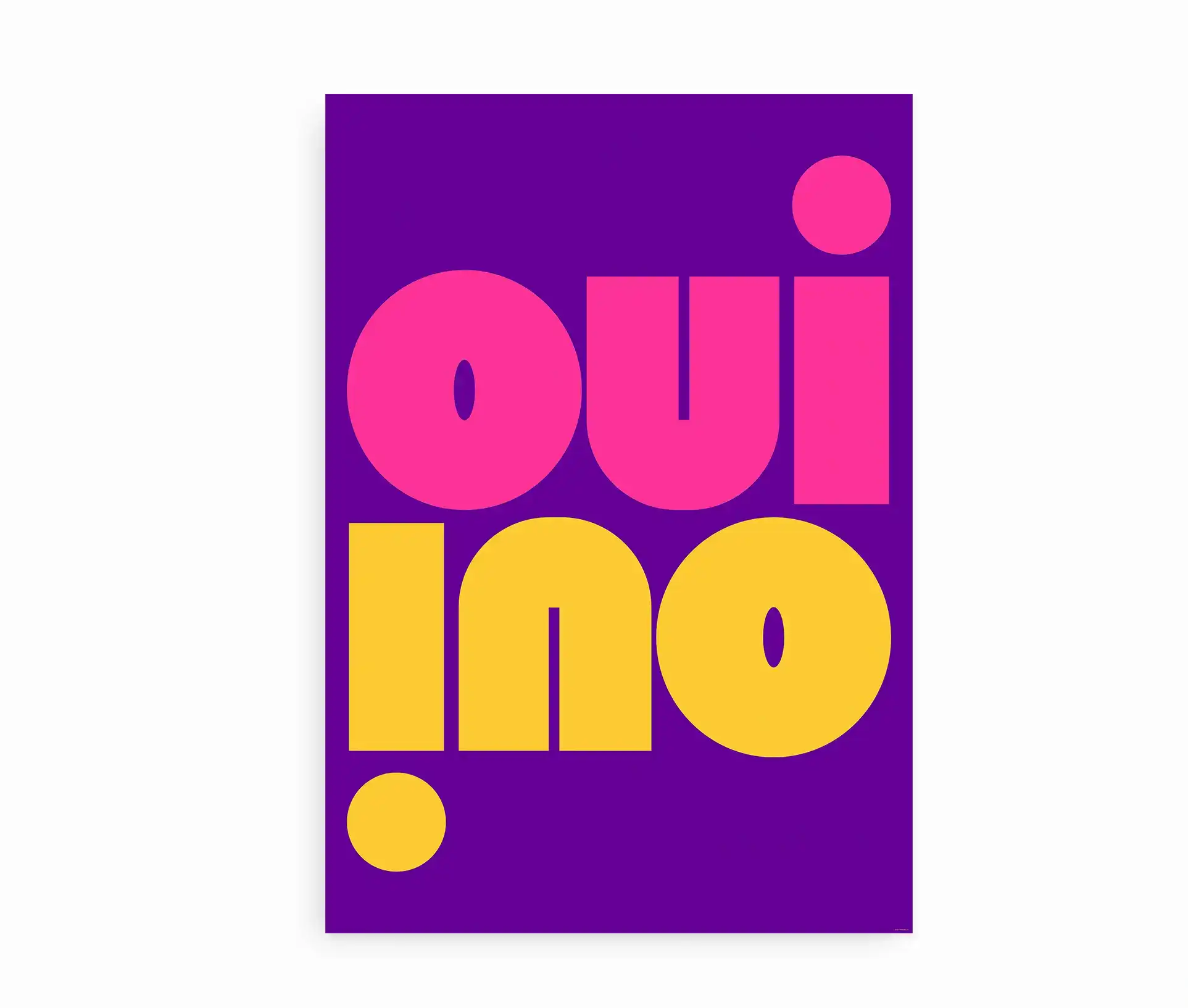 Denne grafiske plakat med teksten “Oui / No” er en leg med modsætninger og moderne formsprog. Med et markant og geometrisk typografisk udtryk i farverne rosa og pink på en grøn baggrund, skaber den både blikfang og balance mellem det enkle og det legende.