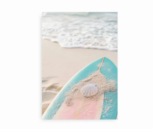 Denne smukke plakat indfanger et roligt øjeblik ved vandkanten, hvor bølgerne lige akkurat kysser sandet. Et pastelblåt og rosa surfboard ligger i forgrunden, let dækket af sand, og med en dekorativ muslingeskal placeret midt på – som et lille strandfund fanget i tid. Billedets lyse farvepalette og det bløde lys skaber en harmonisk og fredfyldt stemning, der emmer af sommer, frihed og strandliv.