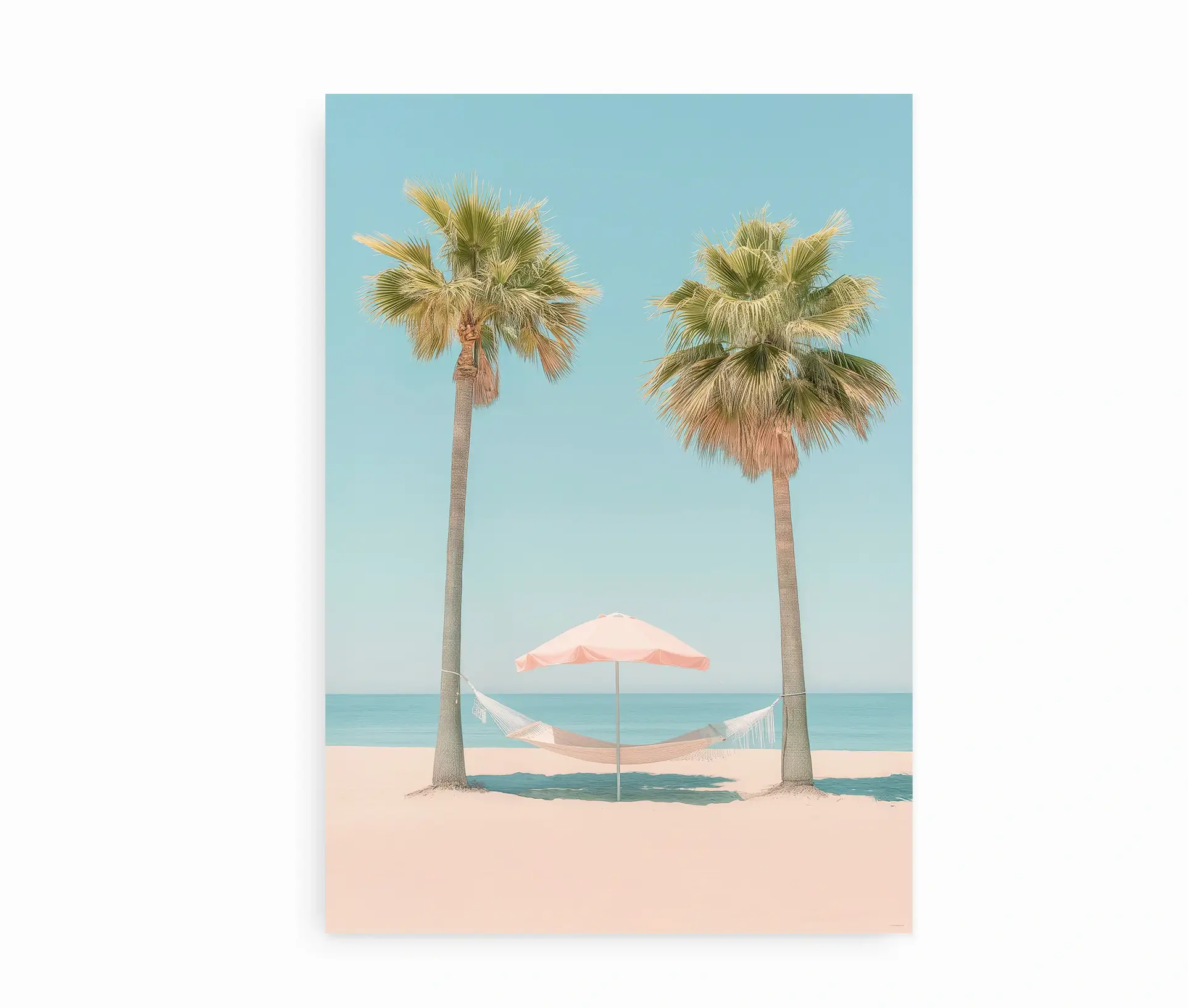 Tag en mental pause og drøm dig væk med denne roligt stemningsfulde plakat, der emmer af feriefølelse, varme og afslapning. Motivet viser to høje palmer, hvor en elegant hængekøje er spændt op imellem. Dette er ledsaget af en sart rosa parasol midt i det bløde strandsand. I baggrunden bag palmer, breder det klare hav sig ud under en himmel i perfekte pastelblå nuancer.
