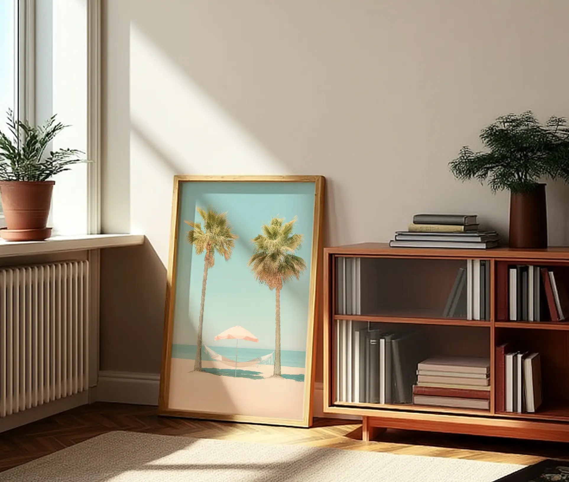 Plakaten udstråler ro og sommerlig nostalgi med sine afstemte og blide farver. Den minimalistiske komposition og det subtile farvevalg gør den velegnet til moderne, skandinavisk indretning. Hvilket hvor den tilfører lethed og balance.