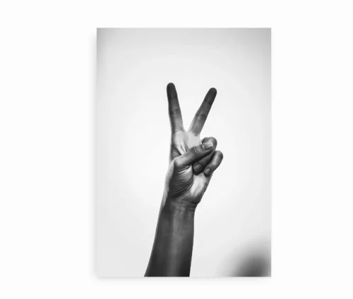 Denne sort-hvide kunstplakat fremviser et kraftfuldt og ikonisk fredstegn. En løftet hånd med to fingre i V-formation – gengivet med fotografisk præcision. Med sit minimalistiske udtryk og neutrale farveskala bringer værket både ro og dybde ind i ethvert rum. Dette fredstegn er samtidig med til at det signalerer håb, sammenhold og positivitet.