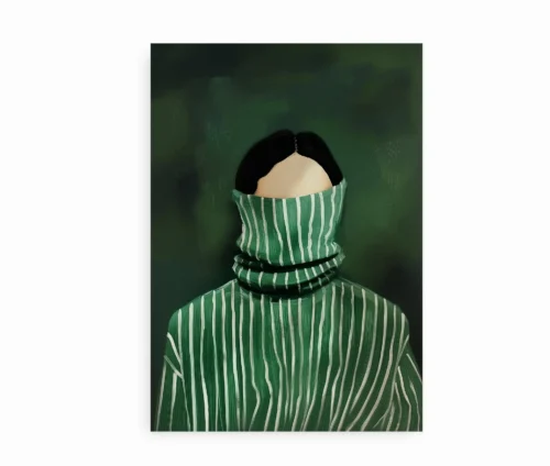 Plakaten Personal Hideout er et moderne kunstværk, der forener enkelhed og mystik i ét og samme motiv. Med en stilfuld gengivelse af en kvinde i en grønstribet striktrøje, der skjuler ansigtet i den høje hals, formår plakaten at skabe et udtryk af både anonymitet og personlighed. De dybe grønne nuancer, kombineret med de markante hvide striber, giver værket en rolig, men samtidig iøjnefaldende æstetik, som gør det oplagt til at indgå i både moderne og klassiske indretninger.