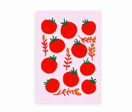 Denne plakat med illustration af tomater er en frisk og farverig tilføjelse til hjemmet, der skaber glæde og liv i køkkenet eller spisestuen. Med sine klare røde tomater og grønne stilke mod en sart lyserød baggrund får plakaten et legende og moderne udtryk, der bringer et strejf af sommer og friskhed ind i rummet. De små dekorative blade i orange og gule nuancer tilføjer varme og balance, hvilket giver plakaten et kunstnerisk og unikt præg.