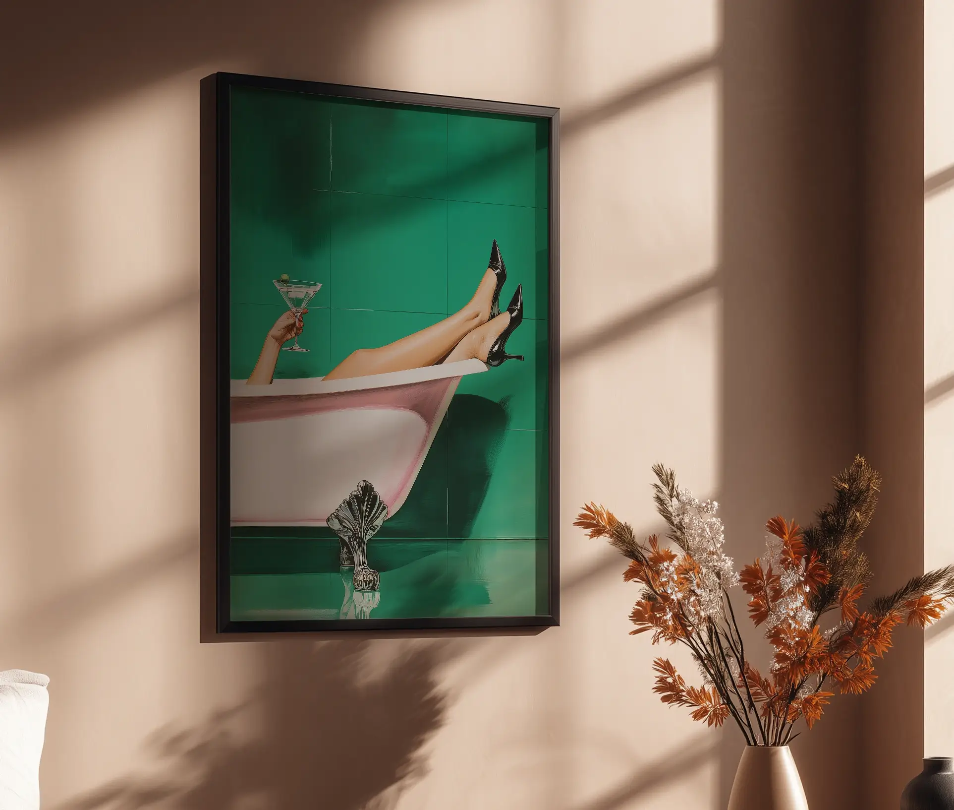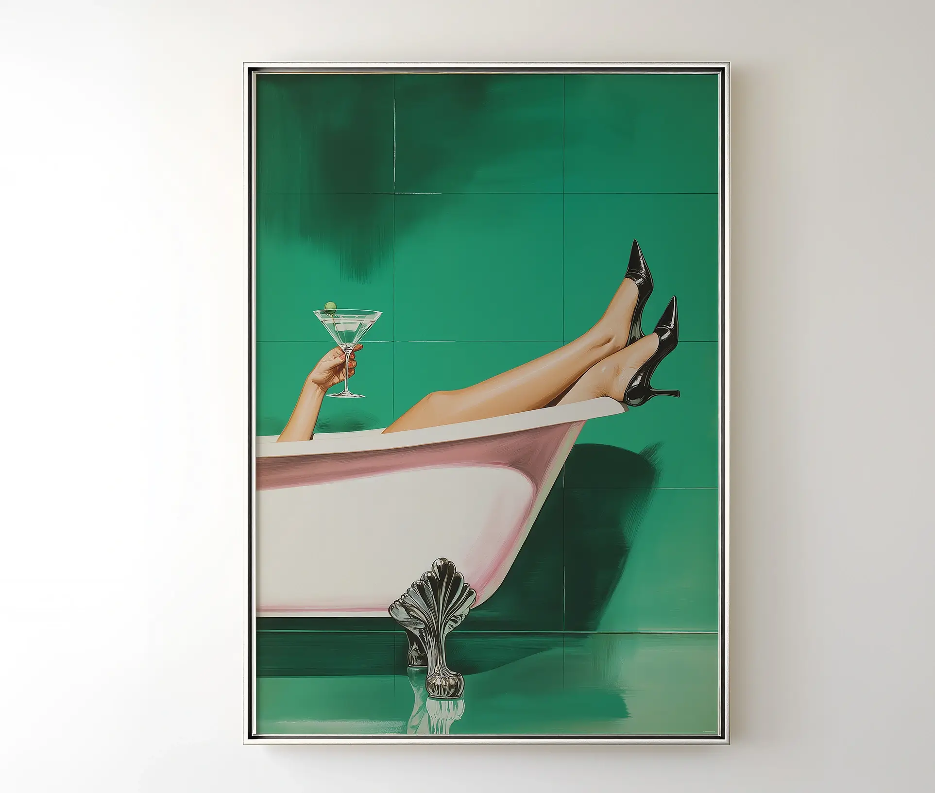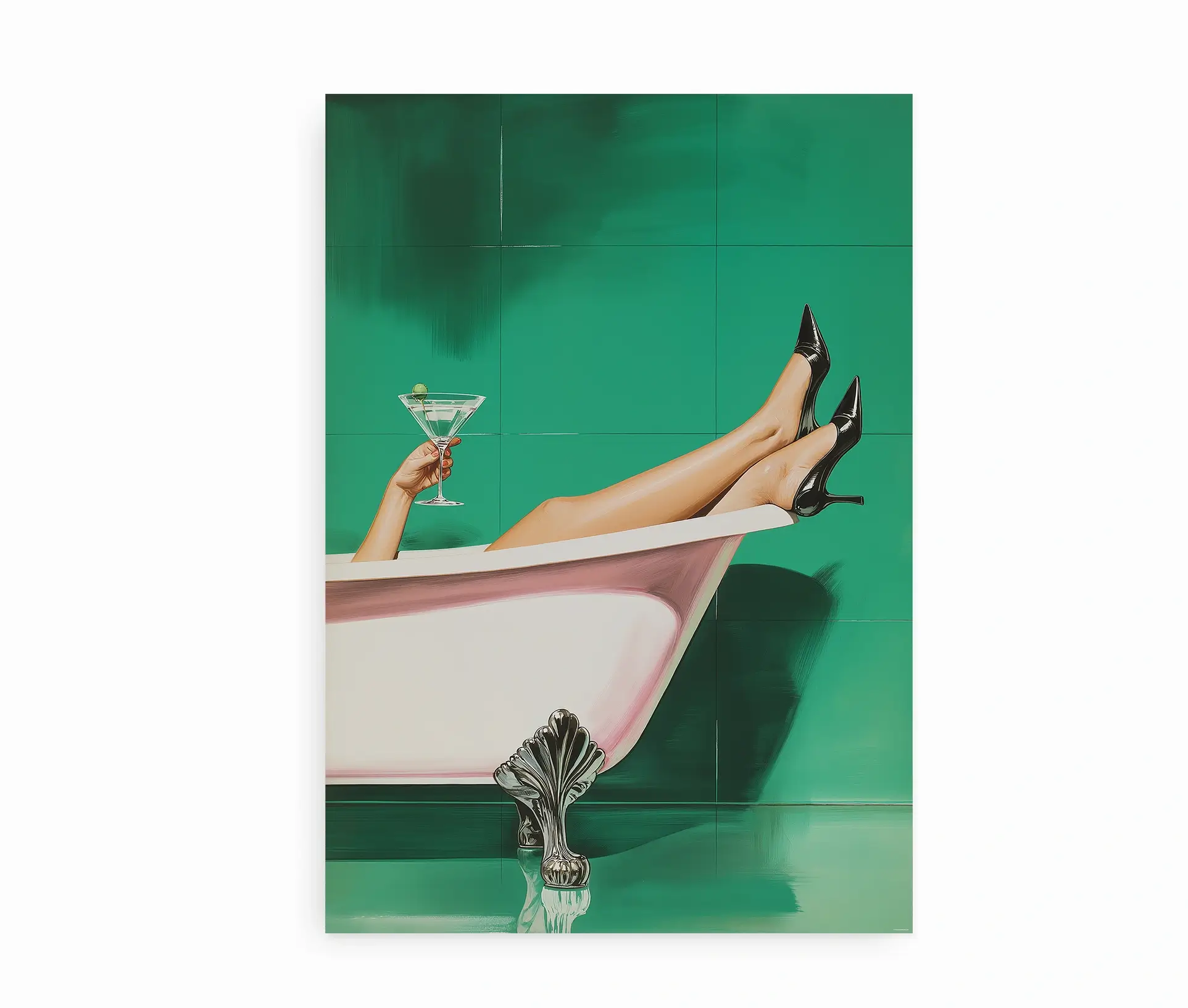Plakaten Put Your Feet Up er en moderne kunstplakat, der med sit legende og glamourøse motiv tilfører både humor og elegance til hjemmet. Motivet viser en klassisk badekar-scene, hvor en kvinde slapper af med benene oppe, iført sorte stiletter og med et glas martini i hånden. Kombinationen af den dybe grønne baggrund, det rosa badekar og de elegante detaljer giver plakaten et stærkt visuelt udtryk, der oser af både luksus og retrostemning.