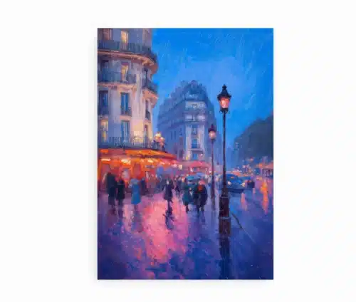 Lad din væg tale fransk! Med plakaten Rainy Night in Paris bringer du både romantik, melankoli og storbyens glød ind i hjemmet. Det levende penselstrøg og de drømmende farver skaber en nærmest filmisk stemning, hvor gadelygterne spejler sig i den våde asfalt, og skyggerne af de forbipasserende væver sig sammen med byens varme lys. Den klassiske parisiske arkitektur danner bagtæppe for en aften fyldt med historie, kunst og atmosfære.