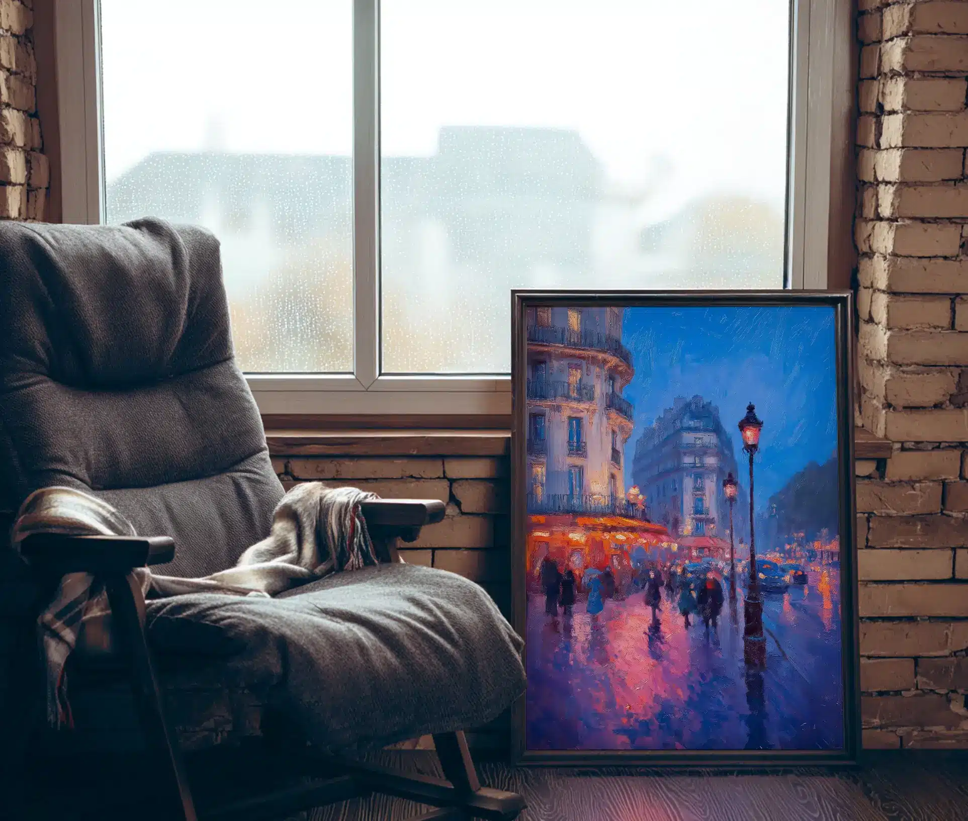 Motivet inviterer dig til en rolig stund midt i hverdagens travlhed – som et åndehul, hvor du næsten kan høre regndråberne og fornemme duften af kaffe og gadeliv. Uanset om du hænger plakaten i stuen, soveværelset eller kontoret, bringer den både elegance og ro med sig.