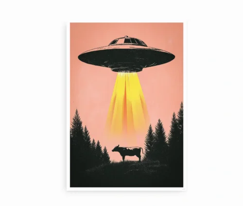 Er du fascineret af sci-fi, konspirationsteorier eller bare god humor? Så er denne plakat et must-have til din væg! Motivet viser en klassisk flyvende tallerken (UFO), der svæver over en mark med høje træer, mens en ko står i rampelyset fra det mystiske rumfartøj. Baggrunden har en smuk støvet rosa farve, der tilføjer en retro æstetik til det futuristiske tema.