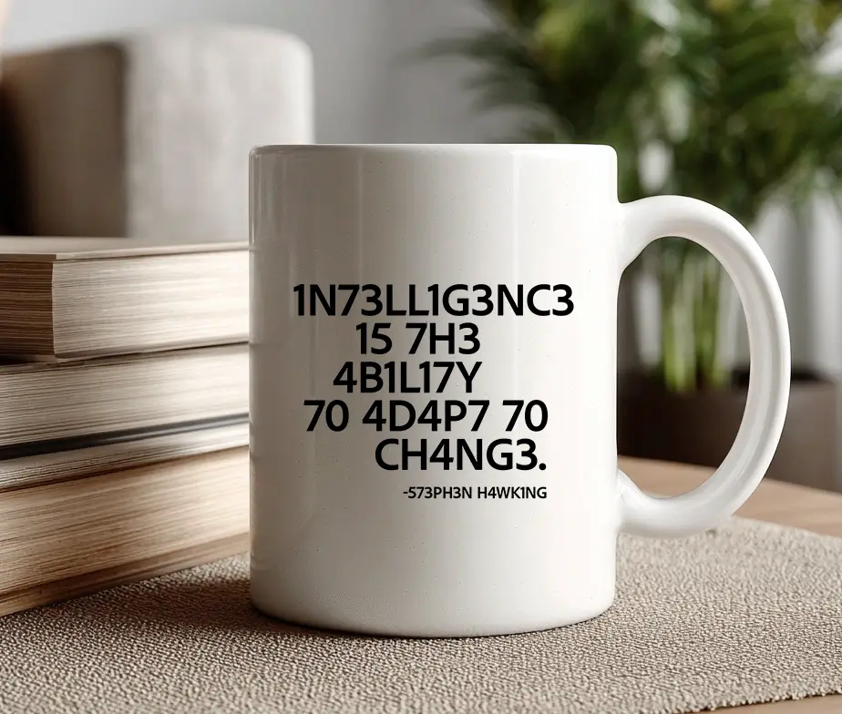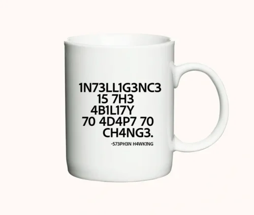 Dette krus er ikke kun en praktisk hverdagsting, men også et inspirerende statement. Kruset er trykt med et ikonisk citat af Stephen Hawking, men i en anderledes og kreativ udformning: leetspeak. Teksten lyder: “Intelligence is the ability to adapt to change.” men er omskrevet med tal og bogstaver. Hvilket gør kruset legende, anderledes og tankevækkende på samme tid.