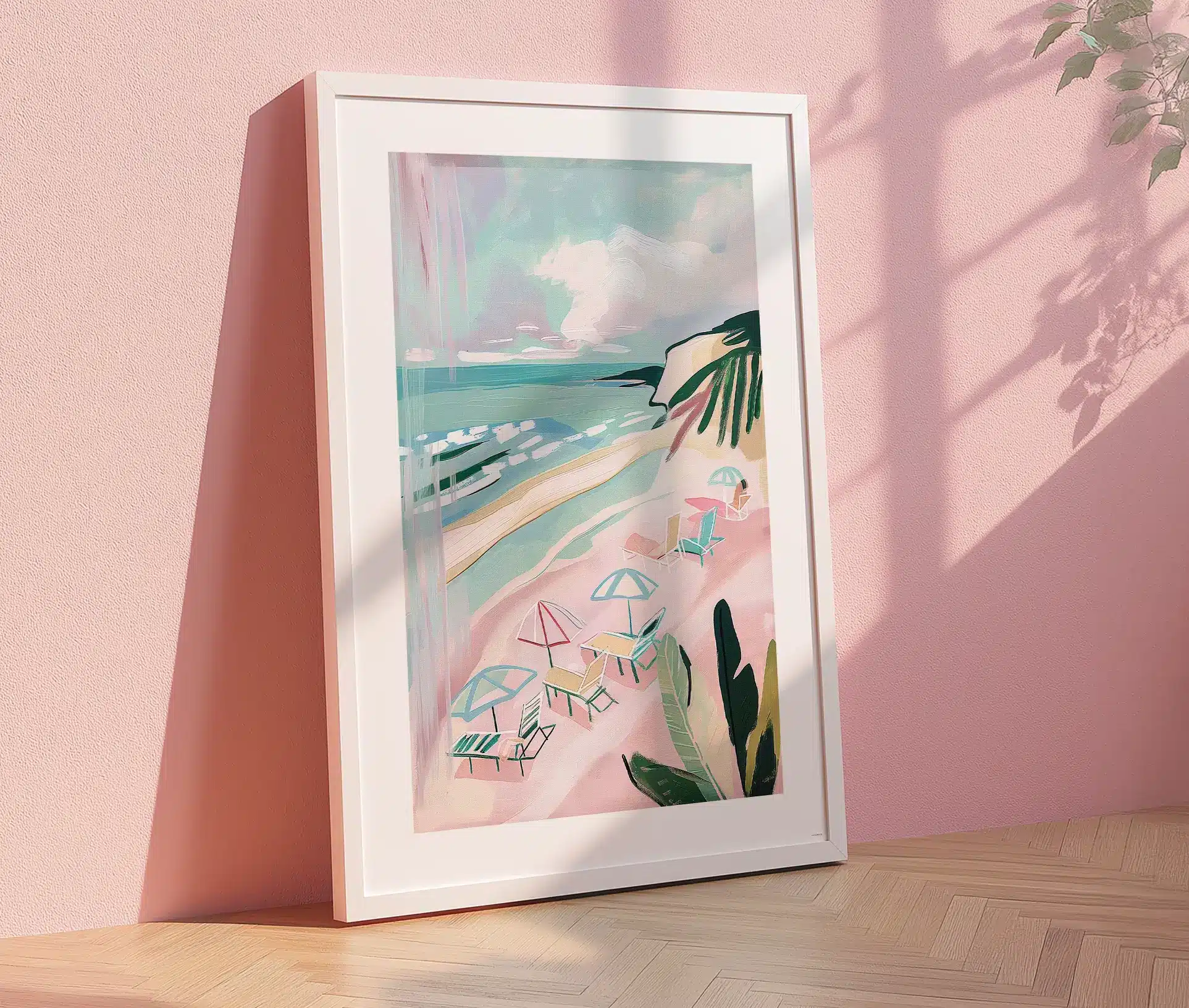 Drøm dig væk til en tropisk oase med denne smukke plakat, der fanger essensen af en solrig dag ved stranden. Illustrationen viser en malerisk kystlinje med bølger, der ruller ind over sandet, farverige strandstole og parasoller spredt langs kysten samt grønne palmeblade, der tilføjer et eksotisk touch.