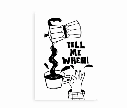Tell Me When er en håndtegnet sort-hvid plakat med humor, energi og et glimt i øjet. Den minimalistiske illustration af en mokkakande og kaffekop, ledsaget af teksten “Tell Me When!”, rammer perfekt den følelse, vi alle kender – når én kop bare ikke er nok.