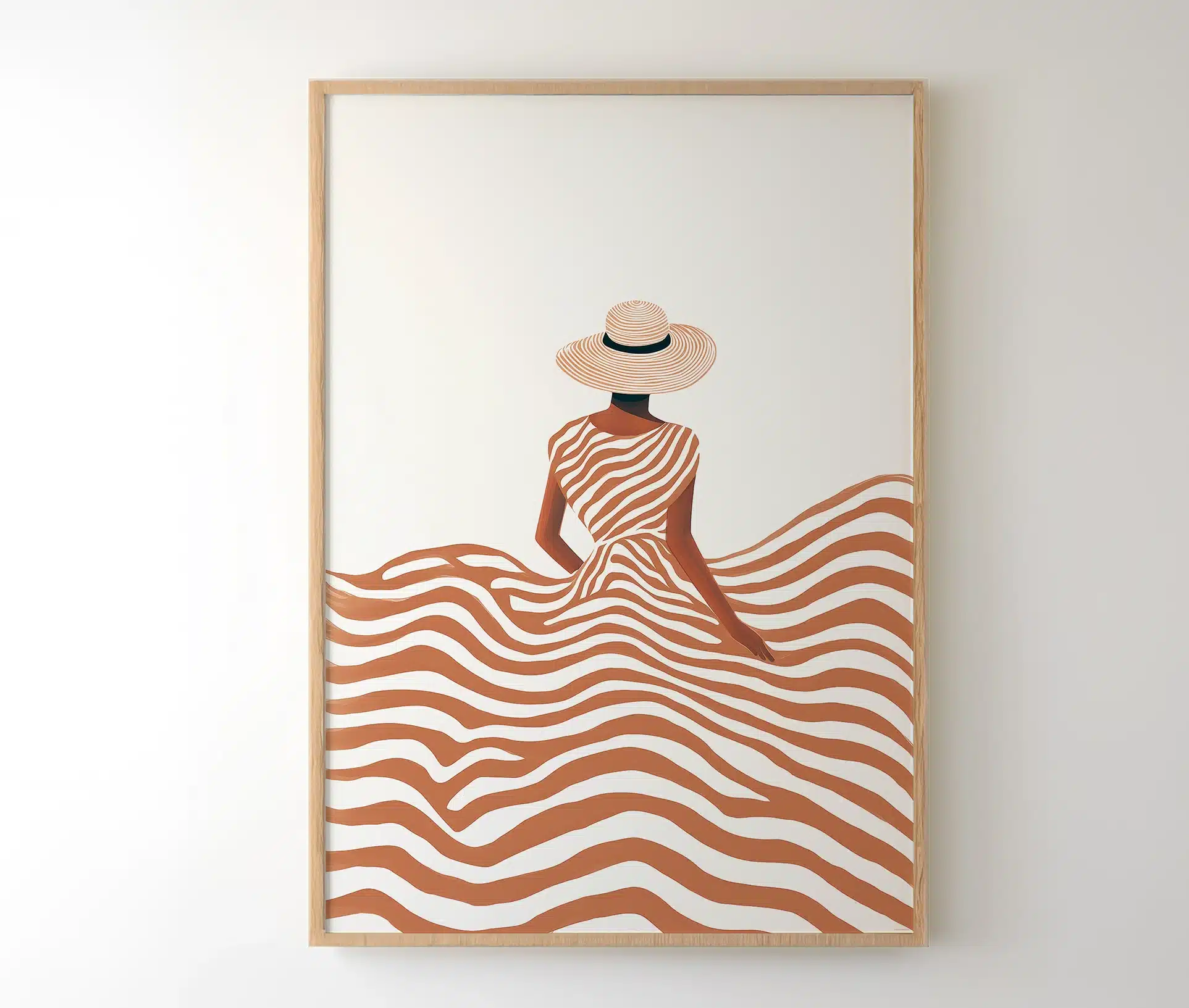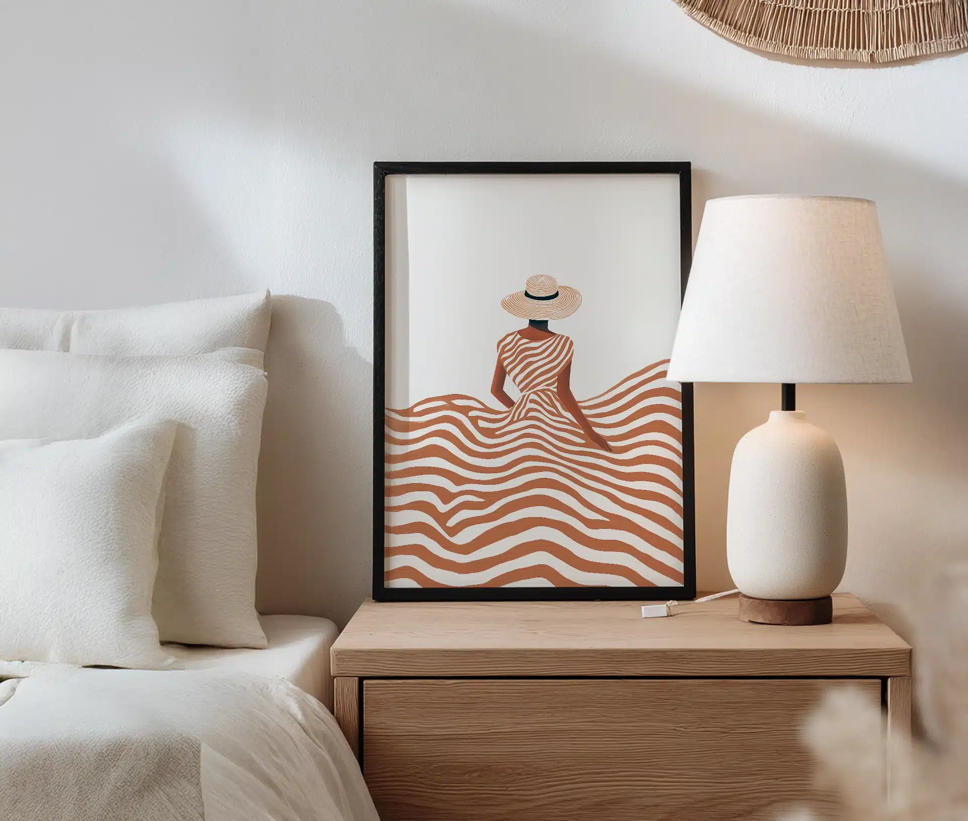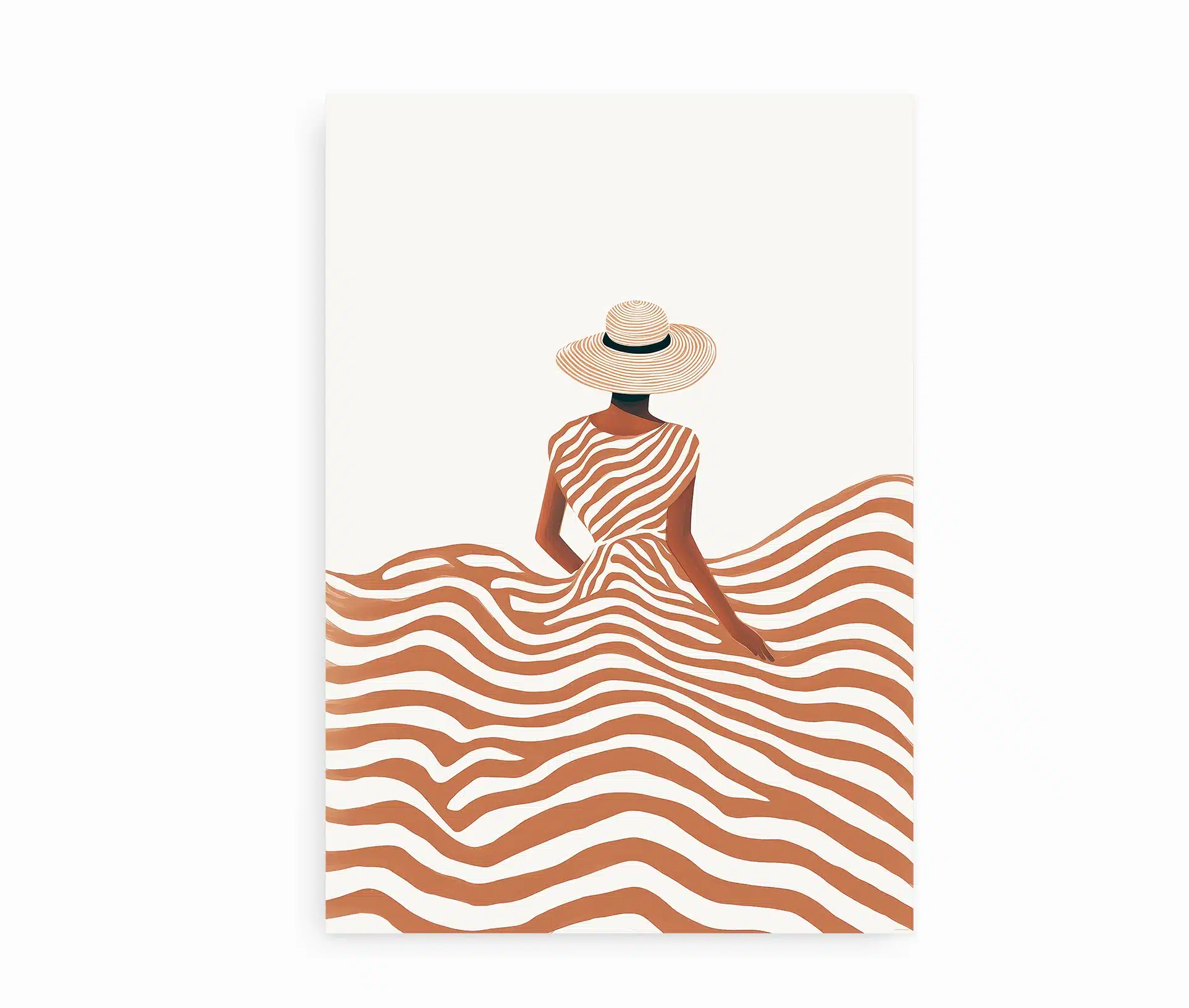 Terracotta Waves plakat er en hyldest til ro, elegance og feminin styrke. Motivet viser en stilfuld kvinde set bagfra med bredskygget hat og en smuk kjole, hvor de terracottafarvede bølger flyder harmonisk ud og skaber en næsten poetisk bevægelse. Det minimalistiske design kombineret med varme jordtoner giver plakaten et eksklusivt og tidløst udtryk.