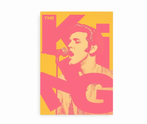 Hyld legenden med denne energifyldte og grafiske plakat af selveste Elvis Presley – også kendt som “The King”. Plakaten er holdt i en moderne pop-art stil med stærke kontrastfarver i pink og gul, hvor Elvis ses synge ind i mikrofonen omgivet af store, markante bogstaver, der staver “THE KING”. Udtrykket er legende, råt og retro på den helt rigtige måde.