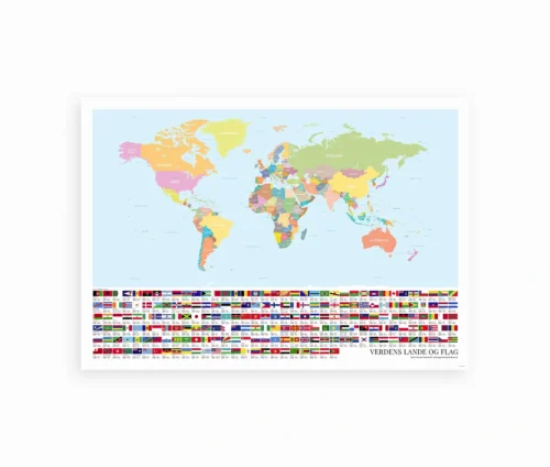 Vores verdenskort med navne og flag er mere end bare et kort – det er et dekorativt læringsredskab.